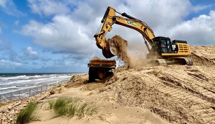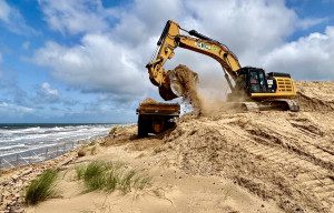 As the major project of removing rubble at Formby Victoria Road continues, a huge digger moves vast quantities of sand covering the rubble. Once exposed, the rubble is crushed and removed from the beach to be used in levelling the area designated for a new car park. The dunes from which the rubble has been extracted are reshaped with the sand removed earlier.