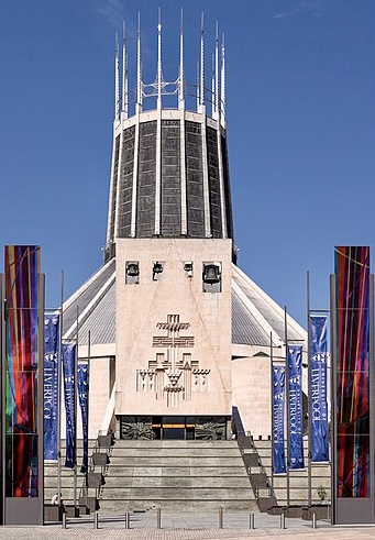 In 1930 the Church purchased the site of the old Brownlow Hill workhouse and Sir Edward Lutyens was commissioned to design a new Cathedral. By now, the Anglican Cathedral designed by Giles Gilbert Scott, was partially built and was a huge building. Lutyens design was massive and would have been the second largest Church in the world. Work began in 1933 but was paused in 1941 due to World War 2. Work recommenced in 1956 and the crypt completed by 1958. Due to rising costs the original plans were modified by Adrian Gilbert Scott but these were not accepted.
